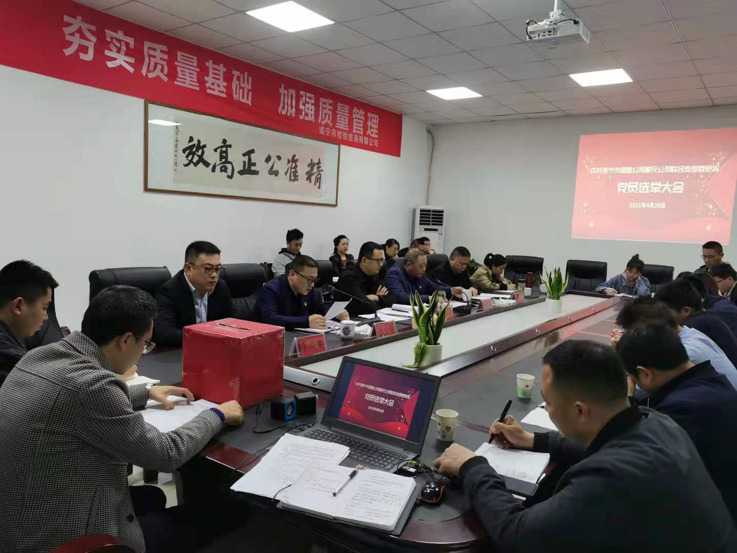 ? ? 大會(huì)在莊嚴(yán)的國(guó)歌聲中拉開(kāi)了序幕。會(huì)上,賈杰洪同志匯報(bào)了成立遂檢公司順元公司聯(lián)合支部支委籌備工作情況,馮凱同志宣讀了興業(yè)集團(tuán)黨委的批復(fù)文件,戴云峰同志組織學(xué)習(xí)了《關(guān)于嚴(yán)肅換屆紀(jì)律加強(qiáng)換屆風(fēng)氣監(jiān)督的通知》。隨后,以舉手表決的方式,大會(huì)通過(guò)了《選舉辦法》、推選了監(jiān)票、計(jì)票工作人員。經(jīng)黨員無(wú)記名、差額投票,賈杰洪、馮凱、戴云峰、薛娟四名同志當(dāng)選為遂檢公司順元公司聯(lián)合支部第一屆委員會(huì)委員。在隨即召開(kāi)的第一屆支部委員會(huì)第一次支委會(huì)上,賈杰洪同志被選舉為支部書(shū)記,馮凱同志被選舉為支部副書(shū)記。